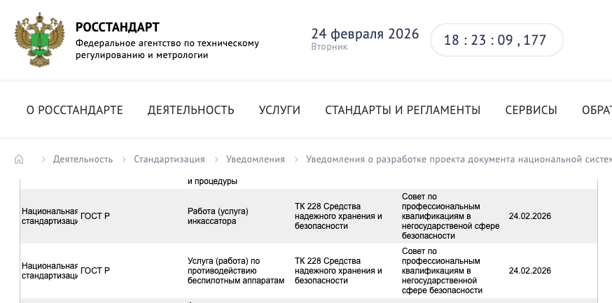 19 февраля 2026 года ТК 228 включил ГОСТ Р “Работа (услуга) инкассатора” и ГОСТ Р “Услуга (работа) по противодействию беспилотным аппаратам” в Программу национальной стандартизации.